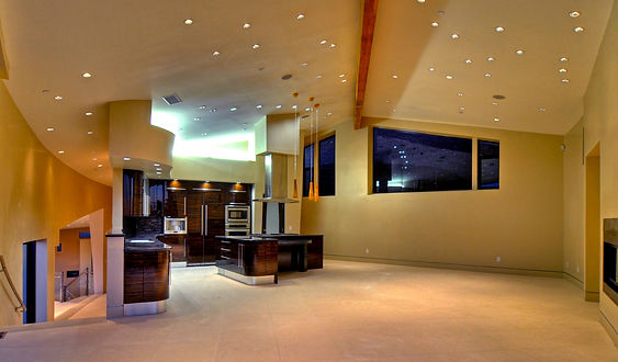The recessed lights over the great room are arranged in a random pattern to suggest stars.